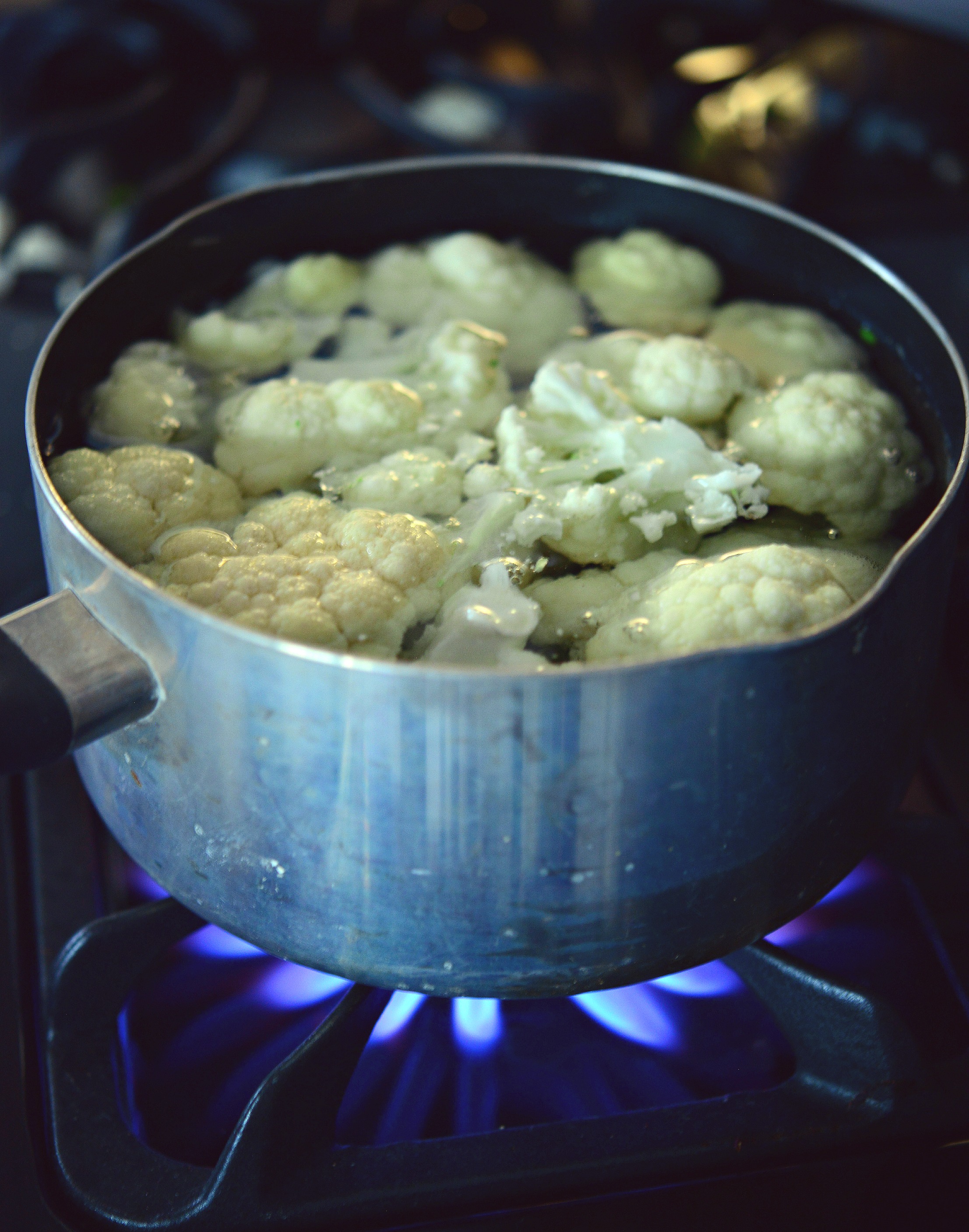 Bring a large pot of salted water to a boil and add cauliflower florets to cook until very tender, about 10 minutes. (You can also boil the broccoli in the same water, to save the planet, you know?)
